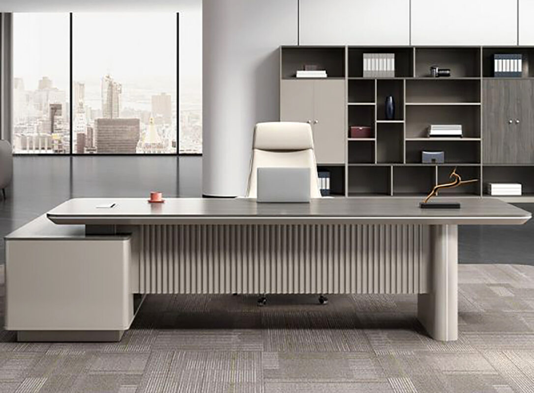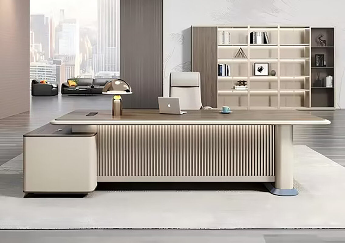 Floating Aesthetic: The desktop appears to “float” above the side return and the main pedestal, giving it a light, contemporary feel despite its large footprint.