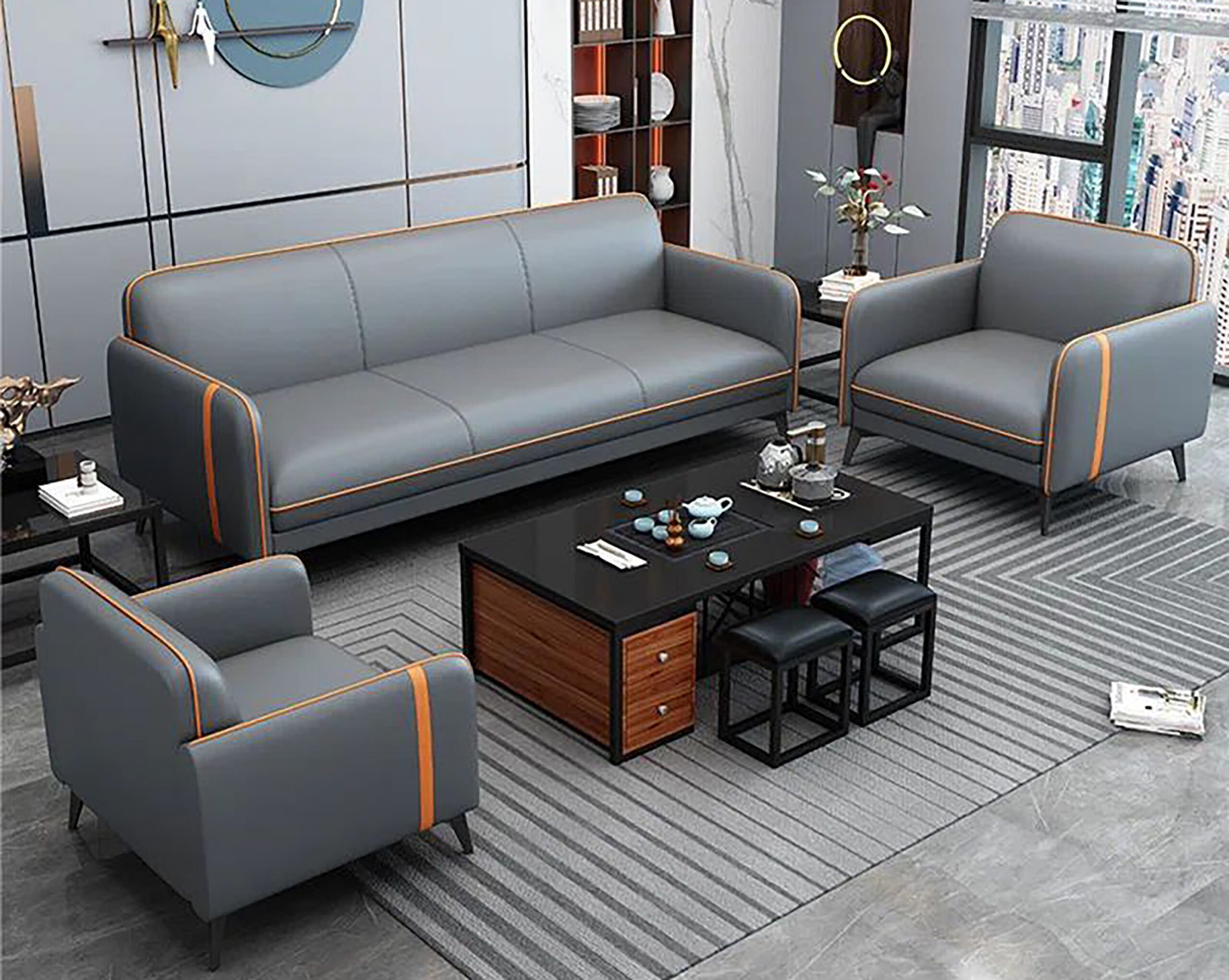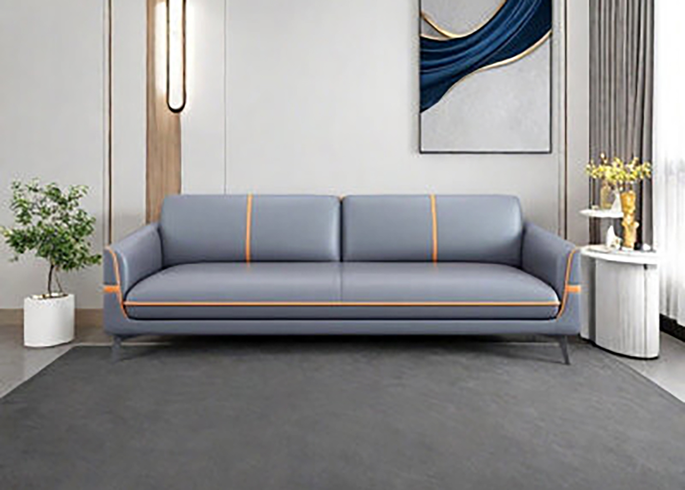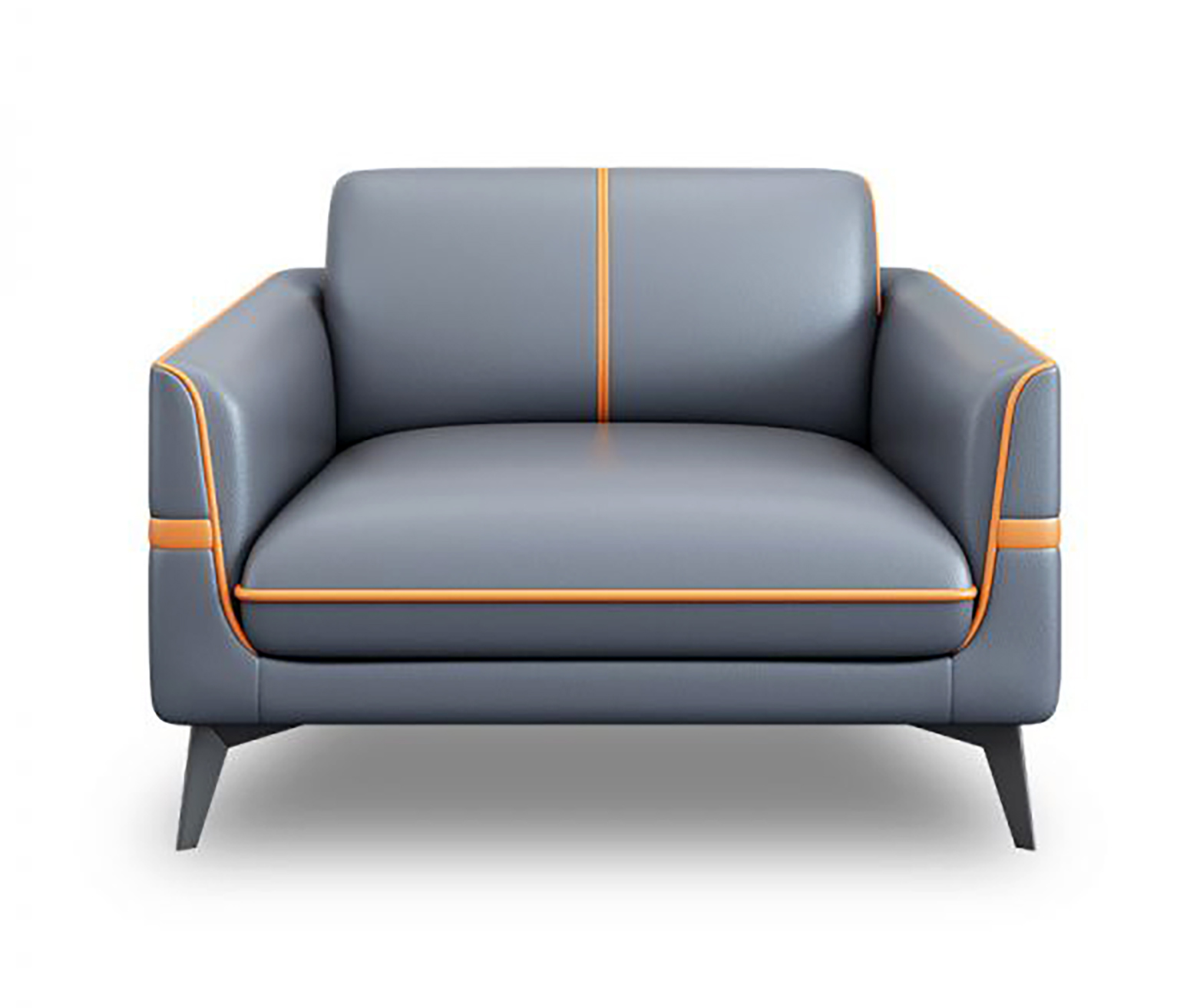 Piping and Trim: Bright orange piping outlines the cushions and armrests, with a vertical orange stripe centered on the backrest.